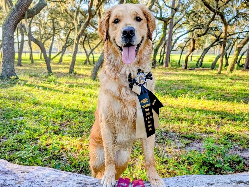 Lily's singleton puppy, Hazel, is my sports dog. This beautiful pup is my first bred-by puppy that I've kept and started training with from day 1. She and her half-siblings out of Rose are the pups who inspired me to start the Golden Scholar Training Program and she continues to inspire me everyday!